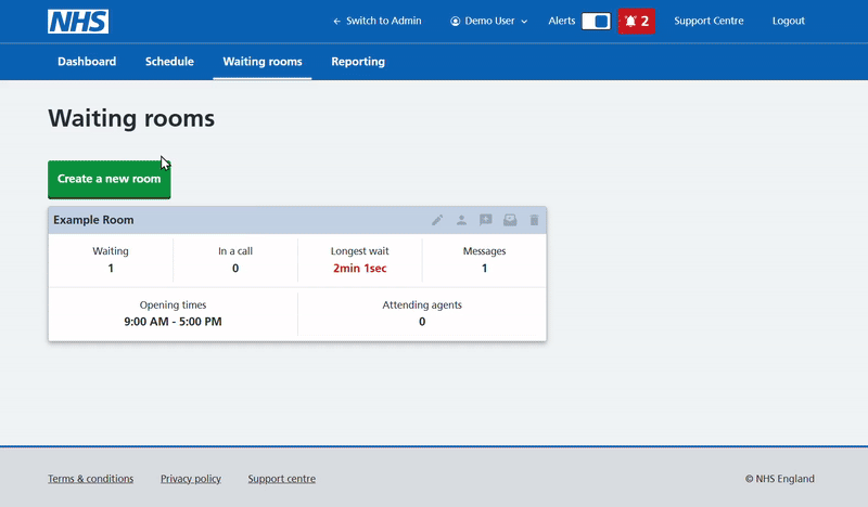 You can view Waiting rooms assigned to you from the Dashboard screen. A Department Administrator can view all Waiting rooms within a department, and a Customer Administrator across the organisation.