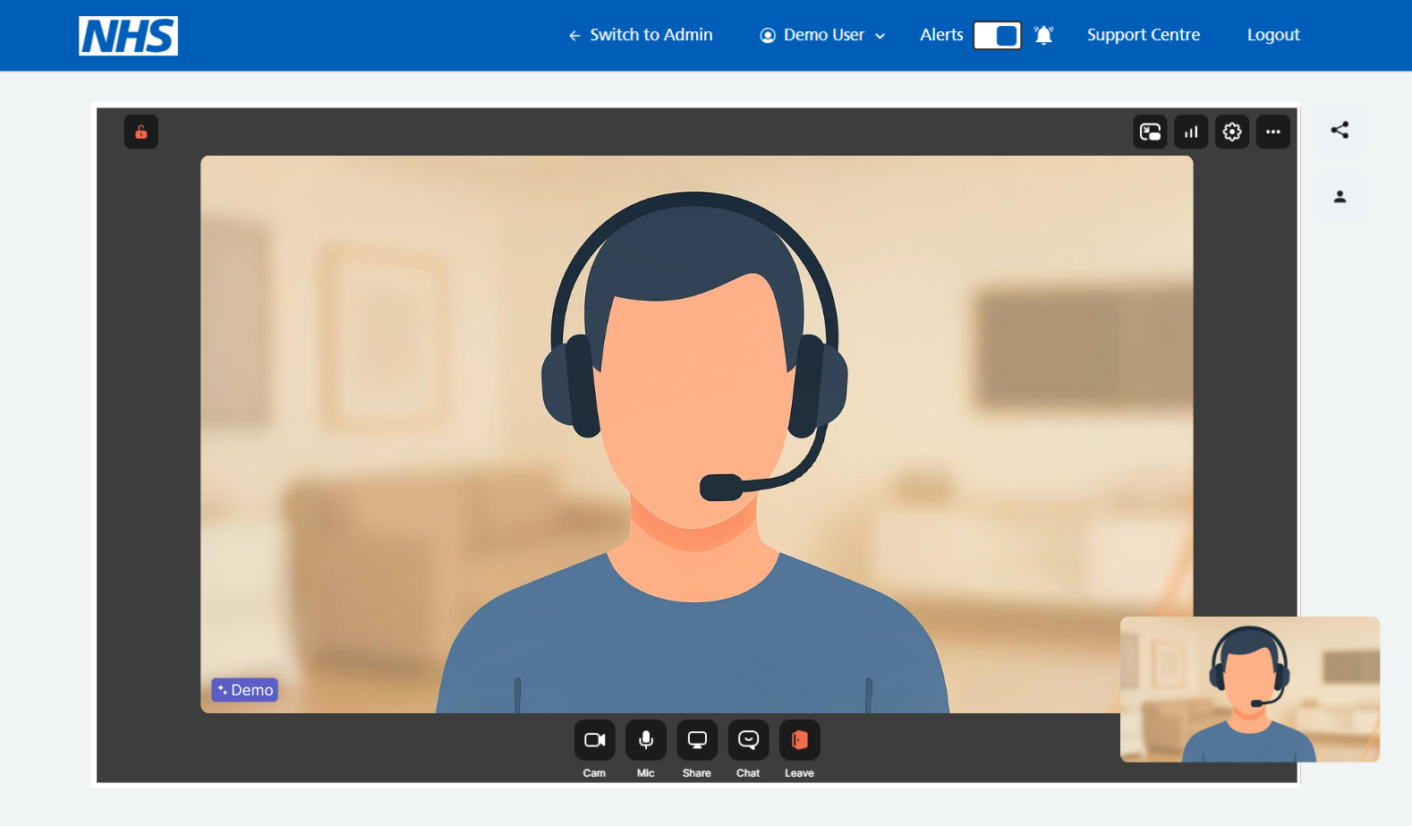 From here the agent/clinician can decide whether to alter call settings via the icons in the top right hand corner of the call screen. Icons here offer the Picture in a picture feature (see example), Meeting diagnostics, Settings (settings cog), Meeting timer and Toolbars (ellipses) - respectively.