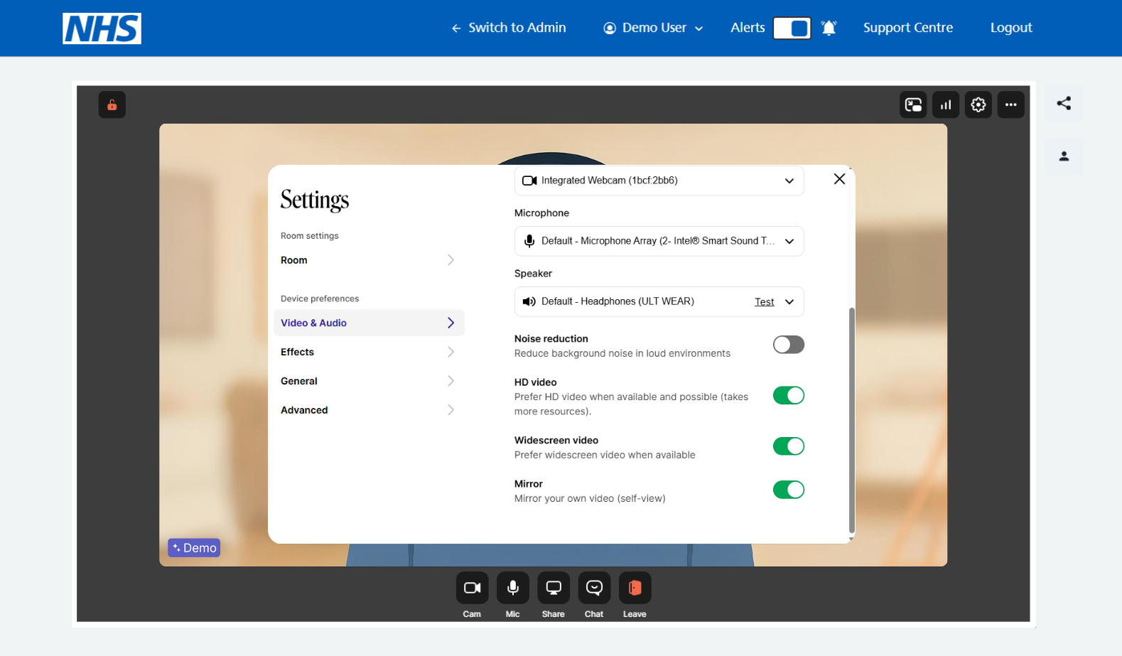 Notably, video and audio settings can be changed by selecting that option, giving an agent the ability to swap out equipment, based on preference, in advance of the consultation.