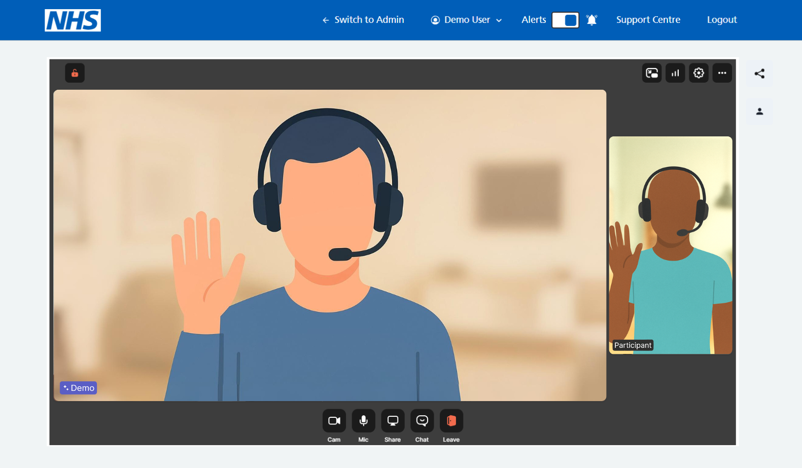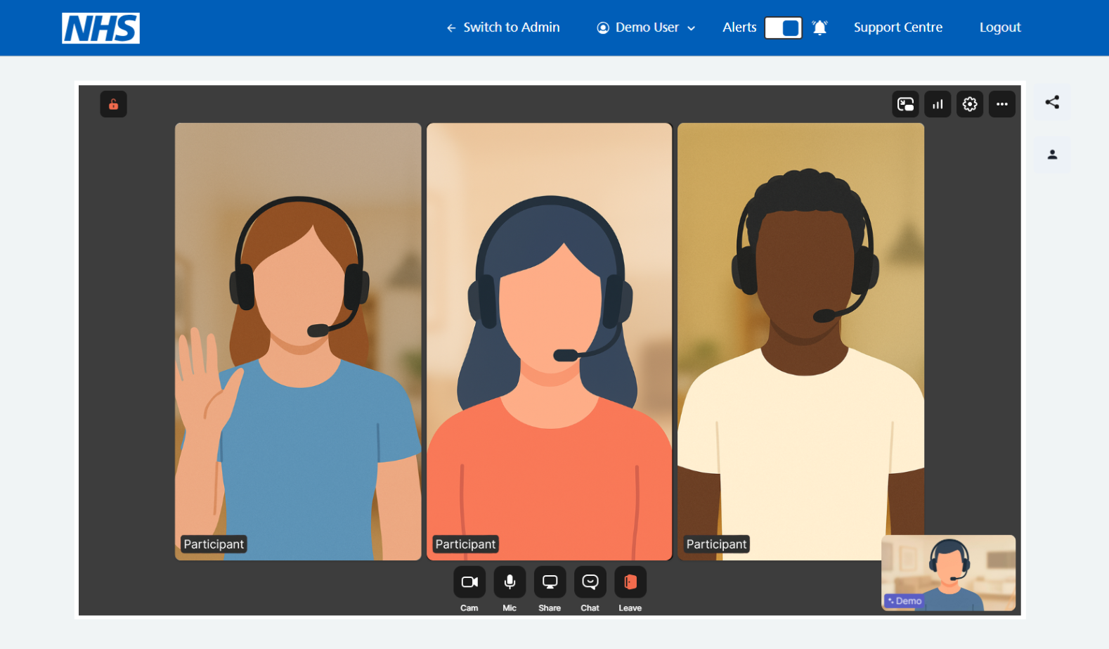 Here is the standard view offered when two customers have joined. The agent is in the bottom right hand corner of the screen, with both customers central to the screen.