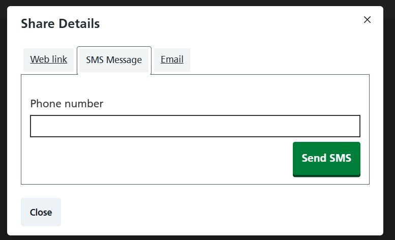 From here, an agent can 'Share the details' by either copying the appointment link via the weblink tab into their own coms, sending an SMS text message or sending an email. The image here displays sending via email.