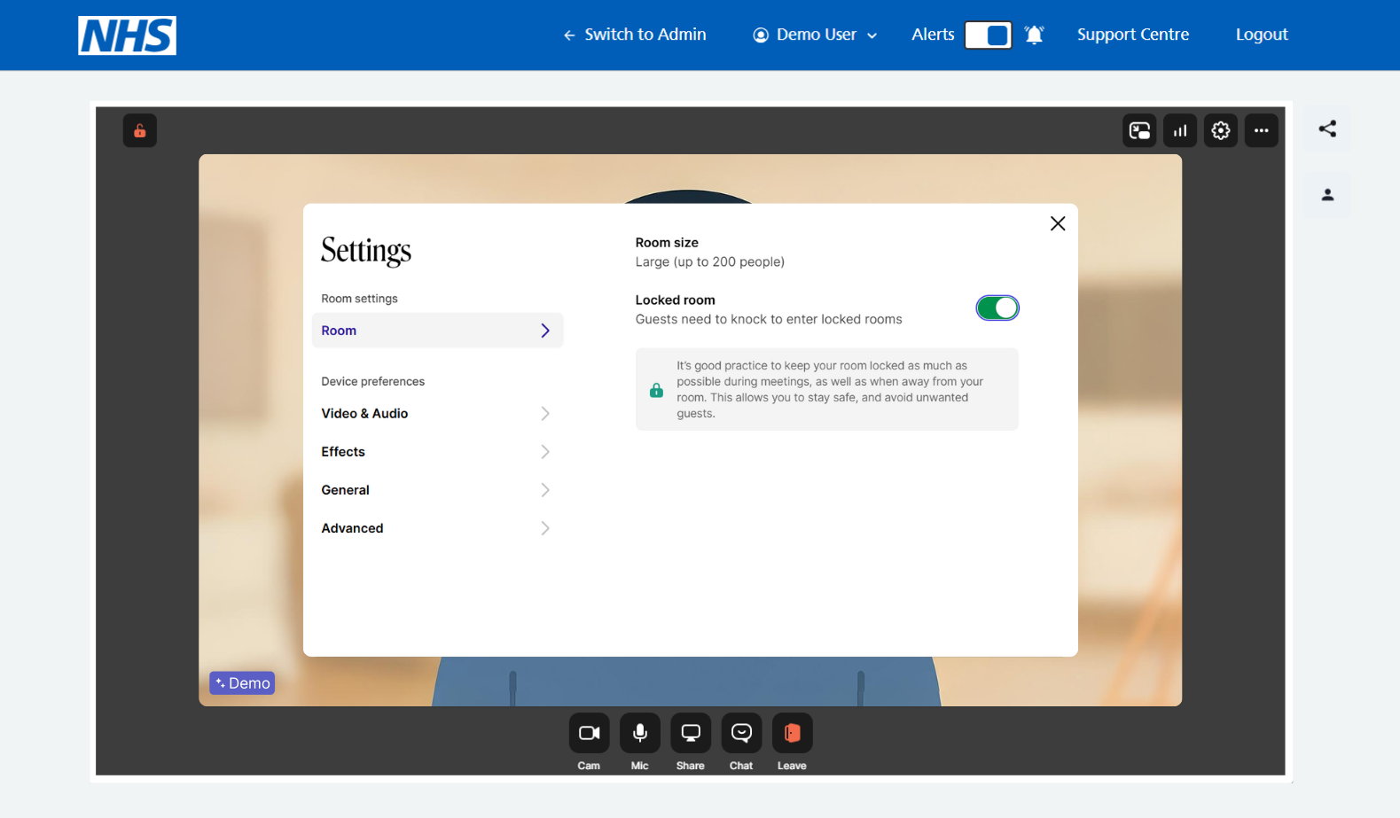 Once the settings cog is selected, you have the flexibility to change Room Settings and Device preferences.