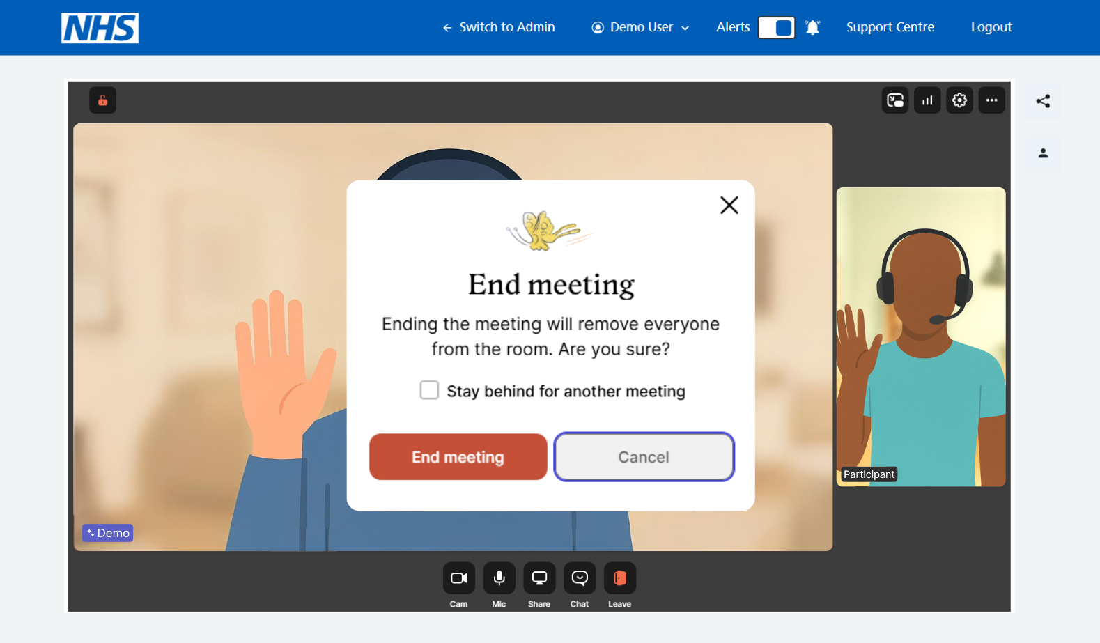 An 'End meeting' notification will appear, to ensure the agent is sure they want to end the call, and can then choose to 'End Meeting'. If selected in error, the agent can choose to cancel and continue with the call.